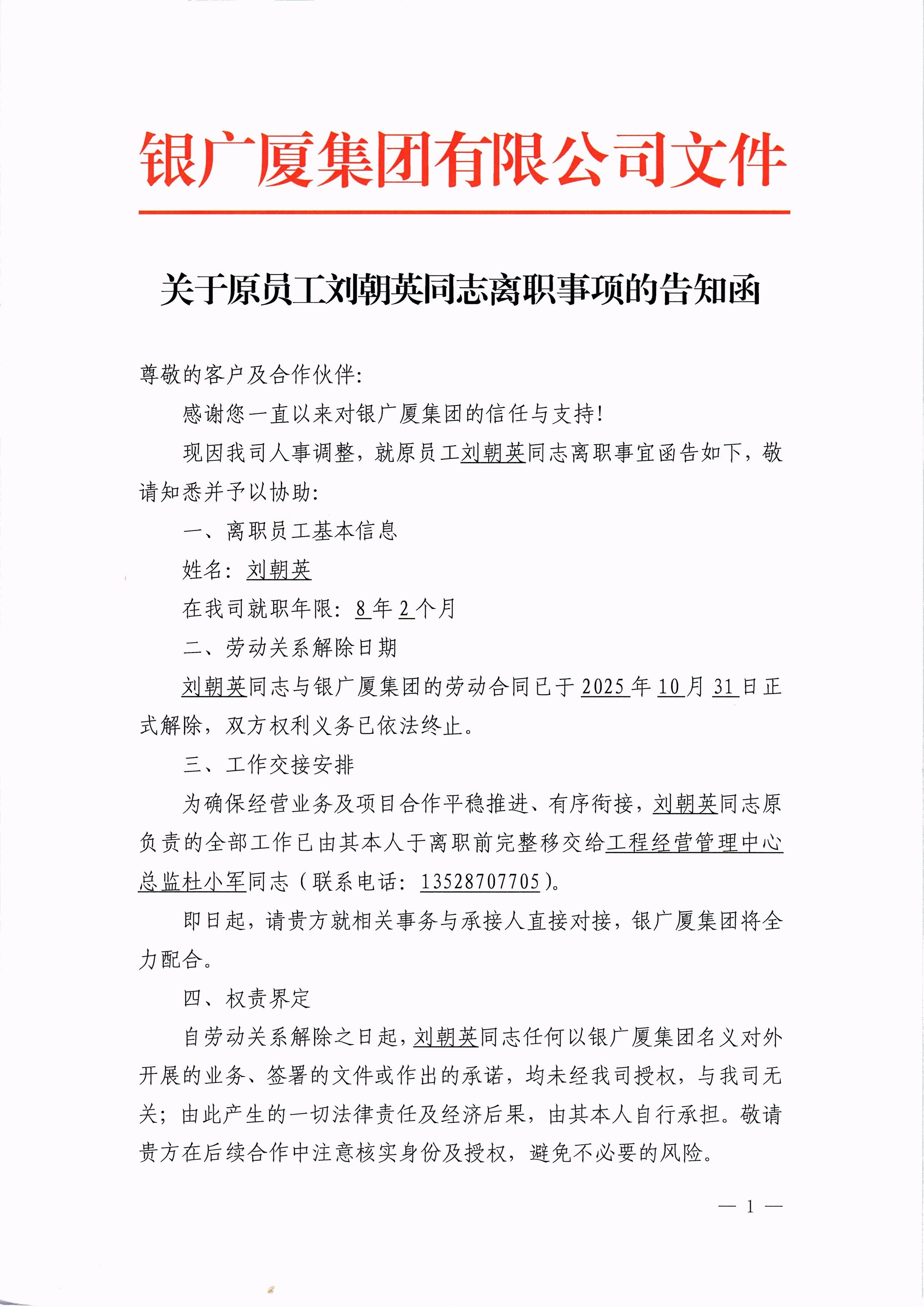 自劳动关系解除之日起,刘朝英同志任何以银广厦集团名义对外开展的业务、签署的文件或作出的承诺,均未经我司授权,与我司无关;由此产生的一切法律责任及经济后果,由其本人自行承担。敬请贵方在后续合作中注意核实身份及授权,避免不必要的风险。