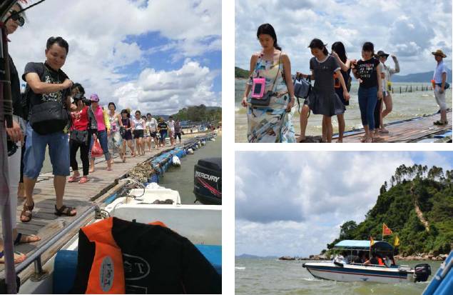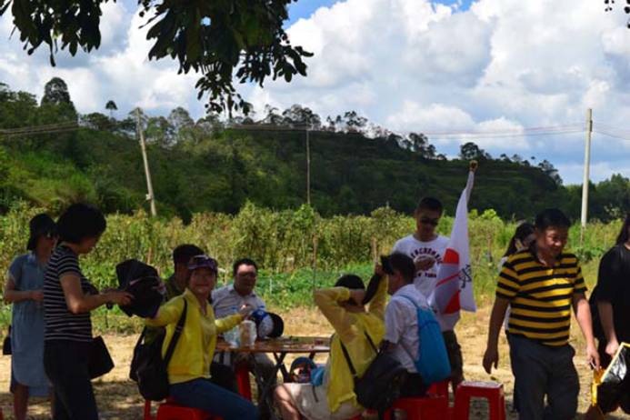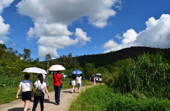 烈日下,三五结队的沿着乡间小路前往采摘、捞鱼的活动地点。