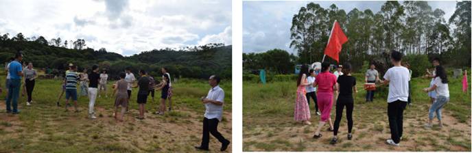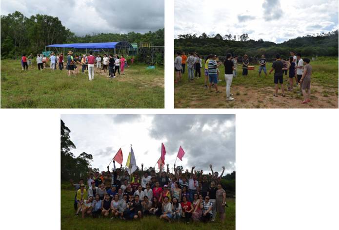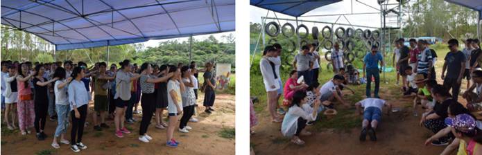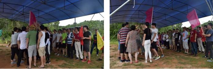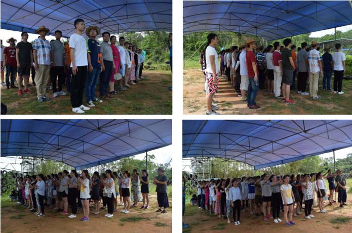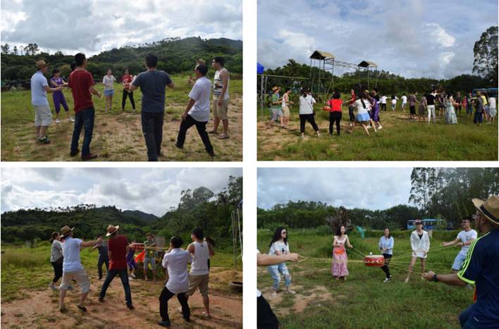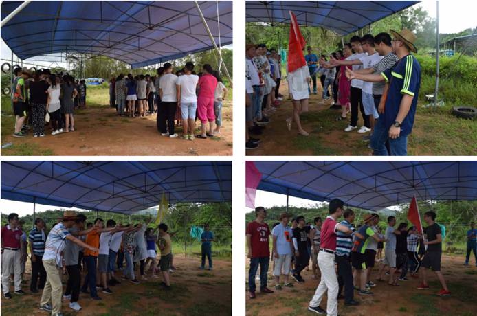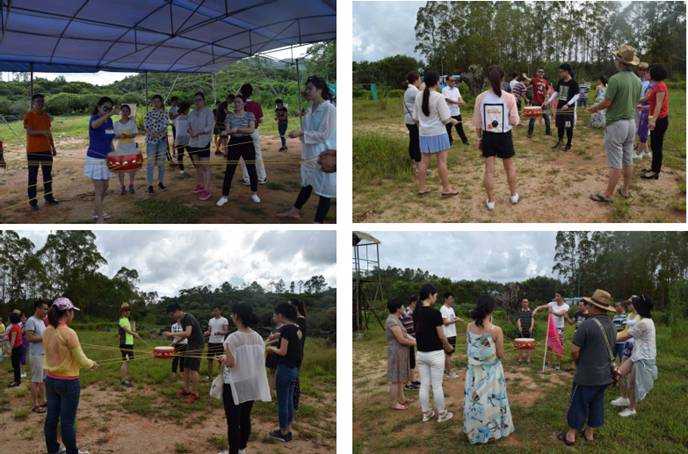 五小组队员都精神饱满,势气高昂,在教练的带领下,几项互动游戏做得有规有矩,默契程度大大提高,增进了交流,联络了感情,互帮互助,齐心协力,共创奇迹。 分组对抗,口号比拼,各展所长,霸气十足。 拓展项目——鼓动人心。竞赛激烈,凝聚智慧,团队应战。