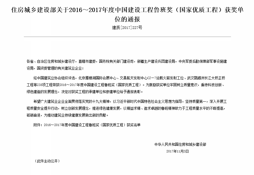 附:住房城乡建设部关于2016~2017年度中国建设工程鲁班奖(国家优质工程)获奖单位的通报