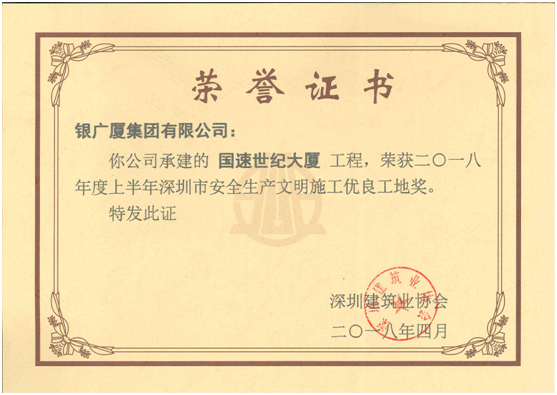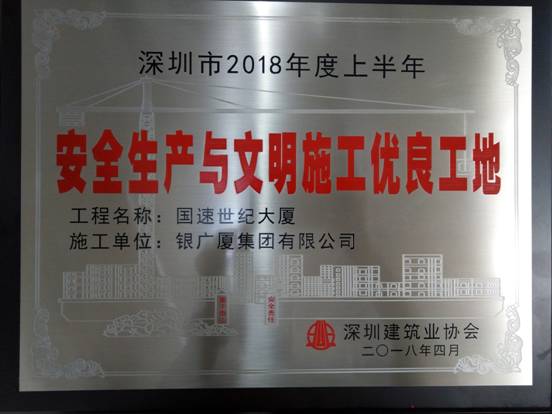 由银广厦集团有限公司承建的国速世纪大厦工程在集团公司的监管督促下,狠抓安全生产与文明施工。经过项目部成员的不懈努力以及对每项施工计划的有效落实,国速世纪大厦工程在2018年度深圳市上半年安全生产与文明施工优良工地评选活动中脱颖而出,被深圳市建筑业协会评为“安全生产与文明施工优良工地”,为公司赢得了荣誉。