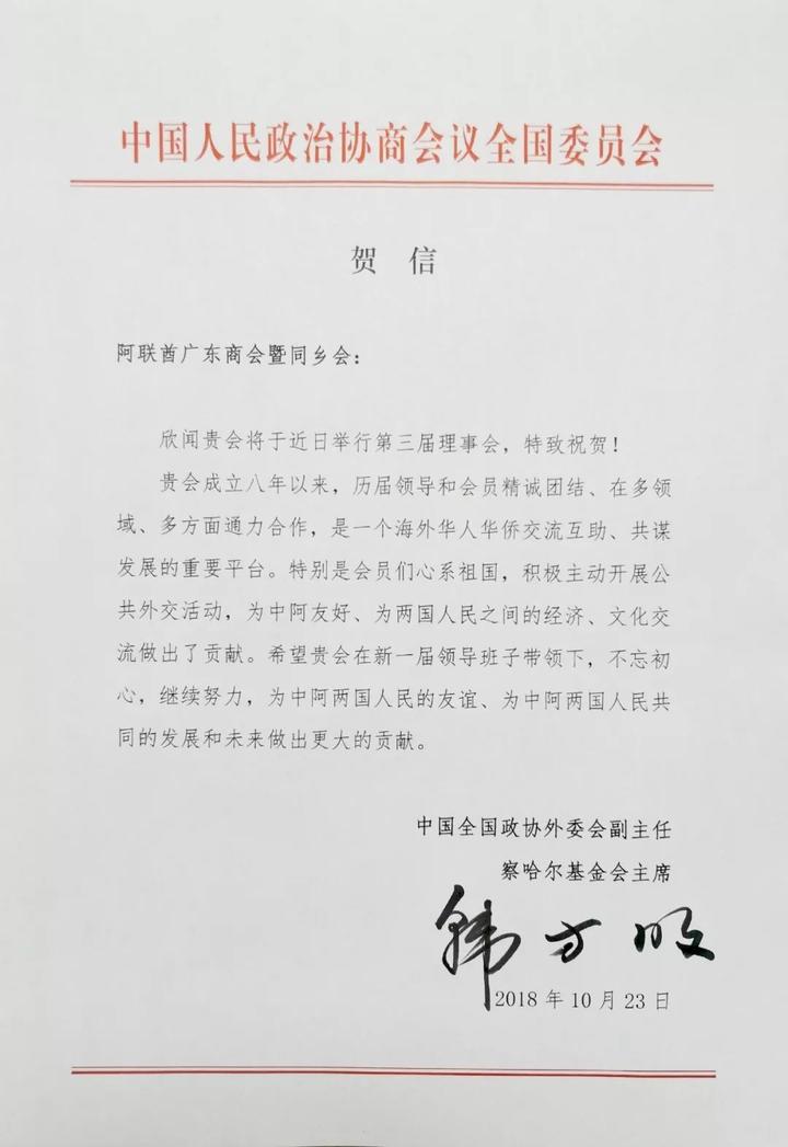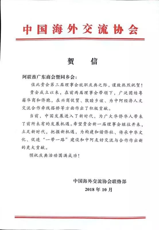 深圳市侨联副主席、银广厦集团董事局主席陈镇文祝贺阿联酋广东商会暨同乡会顺利换届。受深圳市侨办、深圳市侨联的委托,祝贺阿联酋深圳经贸文化促进会在阿联酋迪拜成立,并给该社团来了殷切期望,期望未来在整合两地资源,加深了解,深层次的合作上发挥作用,并祝愿阿联酋深圳经贸文化促进会笃行致远。