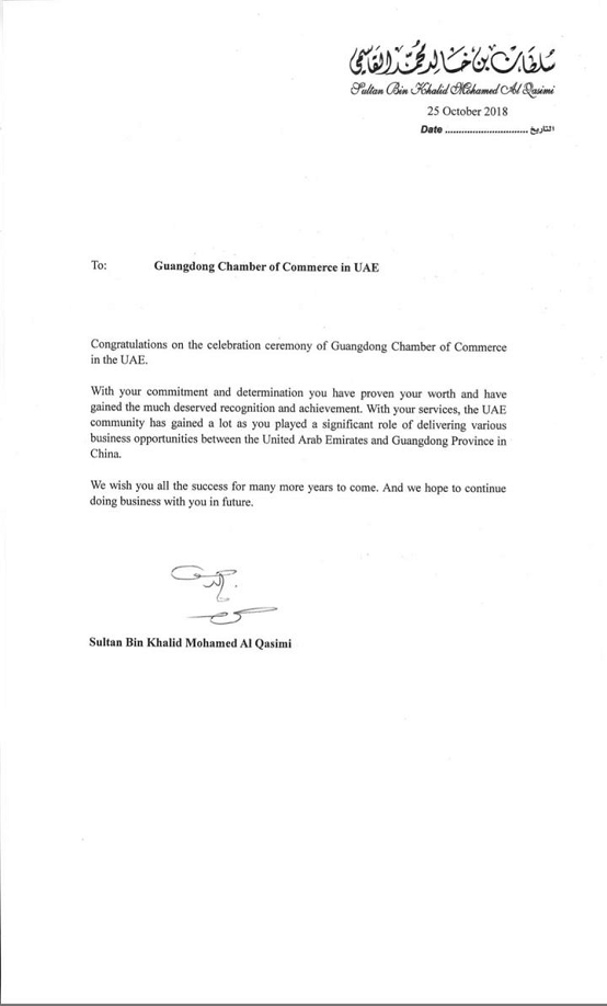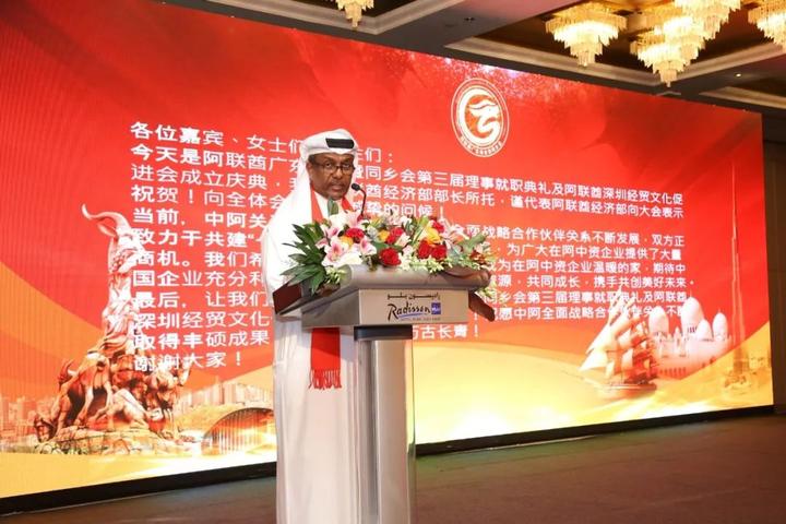 阿联酋迪拜经济部副部长阿卜杜拉到场祝贺并致辞,他祝愿阿联酋深圳经贸文化促进会成立庆典圆满成功,祝贺张钦伟连任会长。并祝愿中阿全面战略合作伙伴关系不断取得丰硕的成果,中阿友谊万古长青。