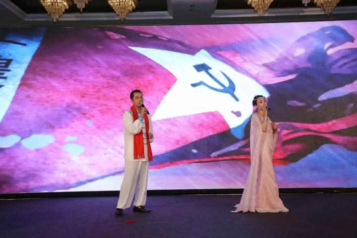 会场欢声笑语,宾客喜庆吉祥。鲜花铺满通道,贺电轮番播放。