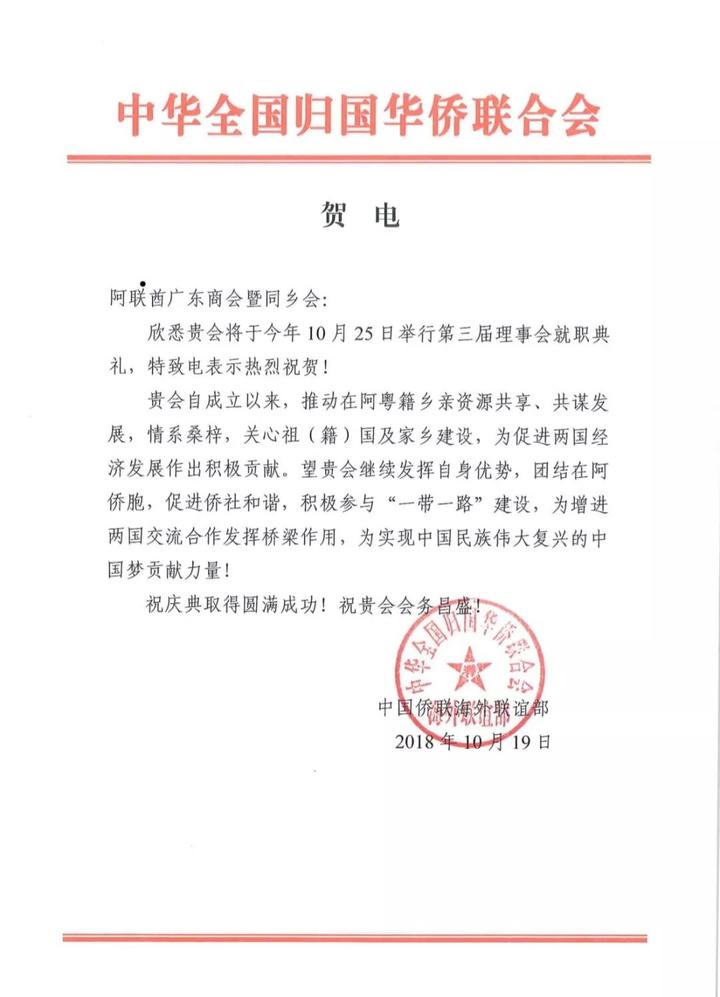 2018年10月25日晚,阿联酋广东商会暨同乡会第三届理事会就职典礼及阿联酋深圳经贸文化促进会成立庆典在迪拜Radisson Blu酒店宴会厅隆重举行。