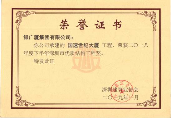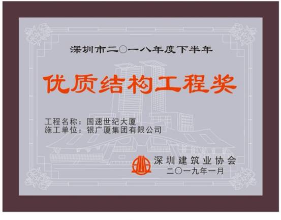 根据深圳建筑业协会《深圳市建筑工程优质奖评选工作办法》,专家组对国速世纪大厦工程进行了中间检查和验收,并经深圳建筑业协会工程质量工作委员会审定和公示,我司施工的国速世纪大厦工程,荣获2018年度下半年深圳市优质结构工程奖。