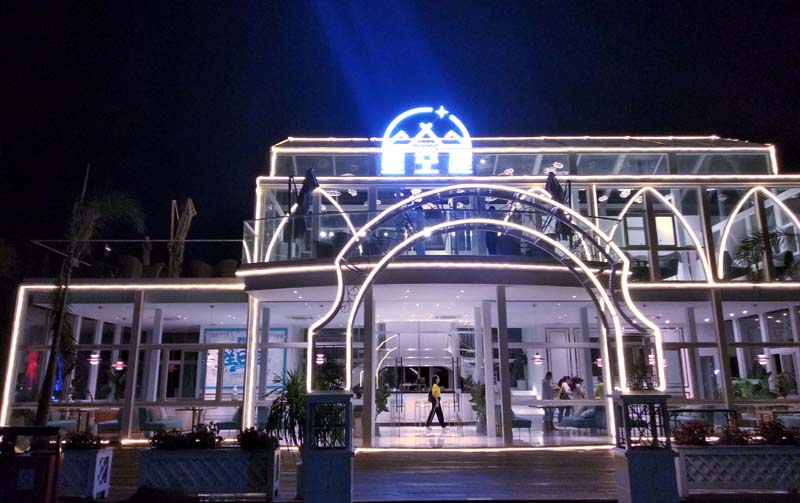 华灯初上,星月当空,穿过如同朱庇特神庙的圆形柱廊,四周是腓尼基特色的花园浮雕,漫步在空旷的大理石阶上,仿佛穿越时空,置身于古罗马时代的天然浴场。