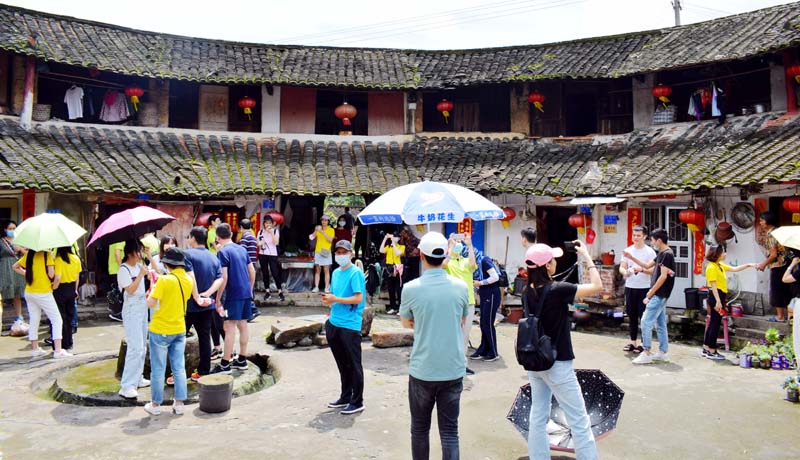 中途来到一个原生态的古村落。整个村庄四面环山,中心一座圆形土楼,名为吴彩楼。以圆楼为中心,石头古厝为扇面向外层层辐射,形成众星拱月之态。吴彩楼建于清朝末年,如今虽已年久失修,但仍风采依旧。