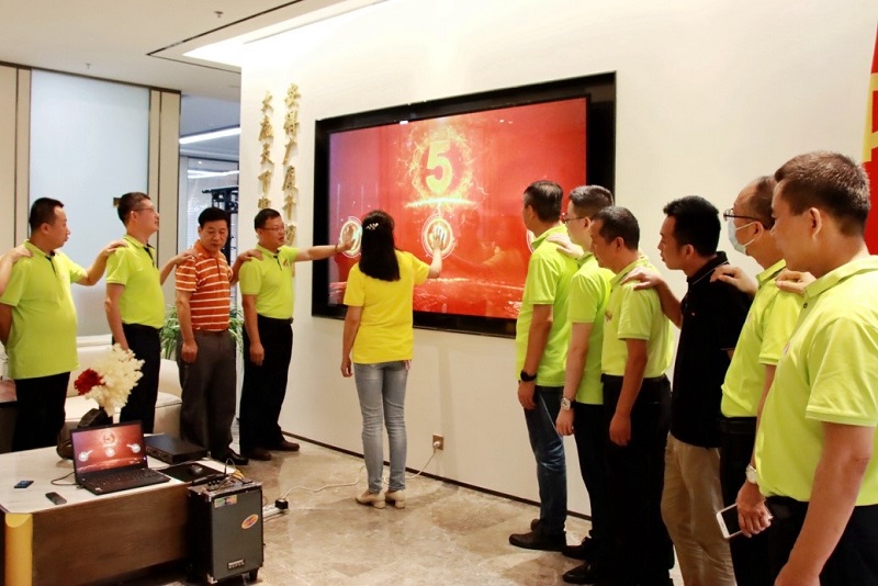 然后,陈书记、李主任、沙主席,深圳银广厦公司的赵总、广裕兴贸易公司的池总,以及集团公司各部门的总监或负责人来到了大屏幕的前面,通过“手搭肩接力”与“手掌对掌印”的方式,共同启动了银广厦集团关爱基金。在场人员用热烈的掌声,庆祝了这一具有特别意义的时刻!关爱基金正式启动以后,意味着大家从此都是“备受关爱”之人,因为大家都是关爱基金的主人和受益者。也正因如此,在接下来的爱心捐赠环节中,大家都踊跃地进行了捐款,为“关爱基金池”蓄得第一波水。