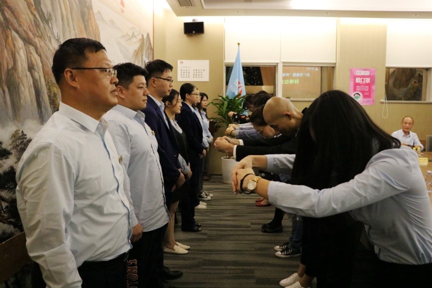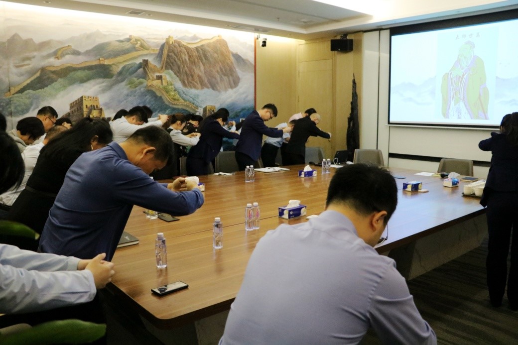 然后,培训经理费翔带领大家学习了如何行拱手礼。拱手礼是最具中国味道的行礼方式,是古代人们相见或表达感谢时常用的一种礼节。拜师时,学生可以向老师行拱手礼,老师同样可采用此方式进行回礼。“端身正仪、整束衣冠,扶手,高揖,为天地立心,拜……”学完拱手礼的行礼方式后,在场的所有人员对着至圣先师、万世师表——孔子的画像,一边念着“横渠四句”,一边向其行拱手礼。通过这样的方式,大家感受了孔子精神的力量,并在内心升腾起一种“尊敬”和“感恩”的情感。