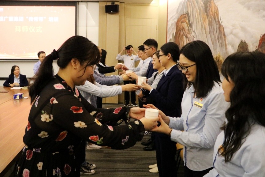“传帮带”培训体现了我司人才培养工作的一大特色,是指由经验丰富的老员工(称为“导师”)对新员工与转岗员工在工作和学习中手把手地传授知识、技能和经验,并给予关怀和帮助,带动“新人”进步的一种人才培养方式。本次举行“传帮带”培训拜师仪式的目的是为了强化导师的身份感,培养学员尊师重道的习惯,明确导师和新员工、转岗员工各自应履行的职责,进而更好地将“传帮带”培训的各项工作落到实处。