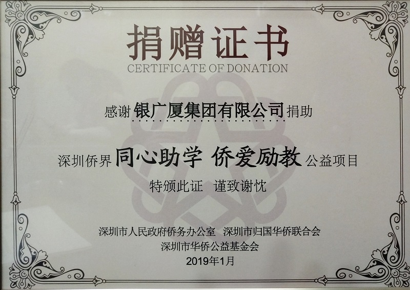 深圳侨界“同心助学,侨爱励教”公益项目捐赠证书